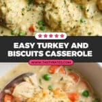 - Assemble the Casserole: Spread the turkey filling evenly in a baking dish. Drop spoonfuls of the biscuit dough evenly over the surface of the casserole, covering the filling as much as possible.