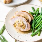 This Turkey Roulade Recipe features a succulent boneless turkey breast rolled with a flavorful whole wheat bread stuffing flavored with sage, celery, onion, and dried cranberries. The roulade is roasted to perfection and served with a rich, savory gravy made from turkey broth and seasoned lightly. Perfect for Thanksgiving or holiday meals for smaller gatherings, this dish combines tender turkey meat with a moist, aromatic stuffing and a smooth homemade gravy.