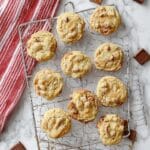 Scoop the dough onto your lined baking sheet and bake for 13–16 minutes. You want the edges to turn light golden brown while the centers still look soft—resist the urge to overbake! Because of the caramel’s sugar, the bottoms can get sticky, so use a thin spatula to gently lift the cookies off the parchment after cooling a few minutes.