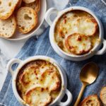 Classic French Onion Soup (Soupe à l’Oignon Gratinée) features deeply caramelized onions simmered in a rich chicken stock and dry sherry broth, topped with toasted rustic bread and melted Gruyère cheese. This comforting, savory soup is finished under the broiler for a golden, bubbly cheese crust and garnished with fresh chives, perfect for a cozy meal.