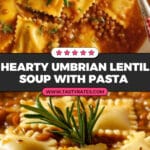 A hearty and authentic Umbrian lentil soup with pasta, featuring small green or brown lentils simmered with aromatic vegetables and herbs, combined with tender pasta for a comforting and nutritious one-pot Italian meal.