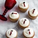 I gently warm refrigerated cupcakes for 10-15 seconds in the microwave before serving. This brings back the softness without melting the icing or “blood.” Just be careful to not overheat!