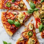 Once out of the oven, sprinkle on some red pepper flakes if you like a bit of spice and tuck fresh basil leaves on top for that burst of brightness. Slice it up and prepare to have your mind blown by how good a veggie pizza can taste.
