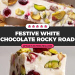 This festive White Christmas Rocky Road is a delightful no-bake treat made with creamy white chocolate, crunchy pistachios, chewy marshmallows, sweet glacé cherries, and shredded coconut. It’s perfect for holiday gifting or indulging in a colorful, flavorful dessert that captures the spirit of Christmas.